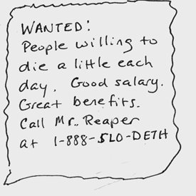 The catch is you have to do something completely meaningless in order to collect your paycheck. You see, I have this big pile of rocks, and I’d like you to move that big pile of rocks, each and every day, day in and day out, from one side of the yard to the other. There’s no real purpose to all this lifting and toting. I just like to have my rocks on the left one day and on the right the next. I’m funny that way. Oh, and don’t ask where I’m getting the money. That’s my little secret.